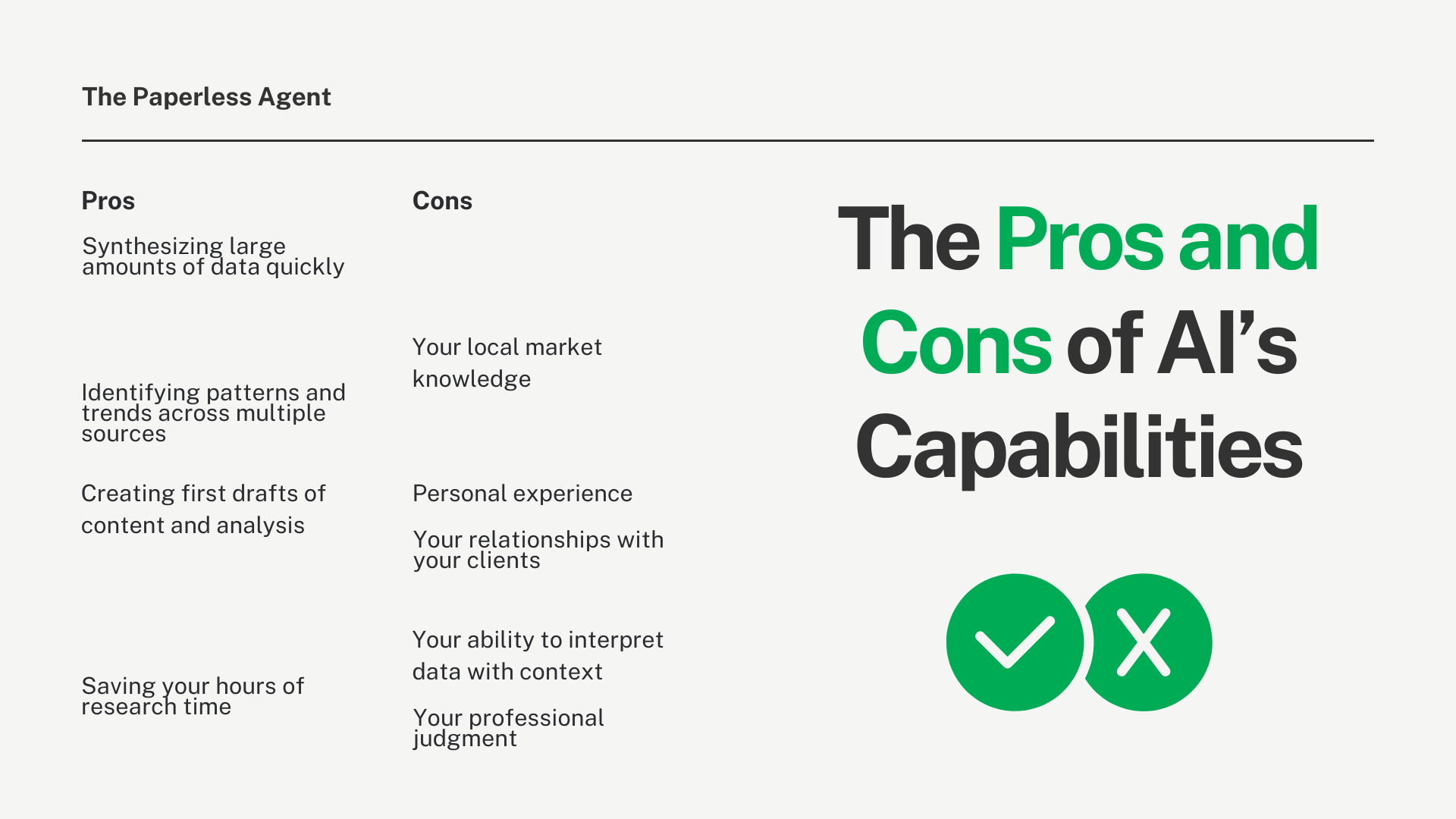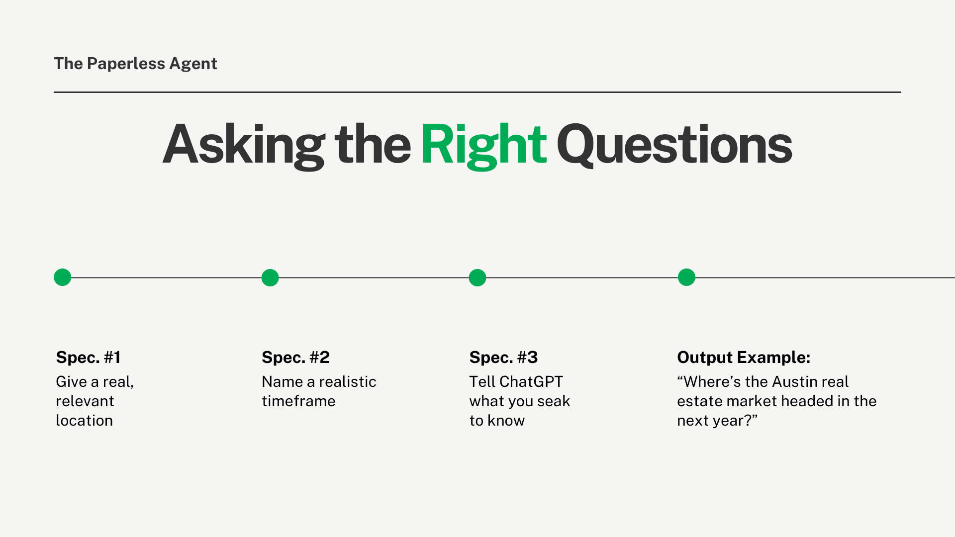 Think of ChatGPT as your research assistant, not your replacement. It does the time-consuming data gathering so you can focus on what you do best: advising clients and closing deals.