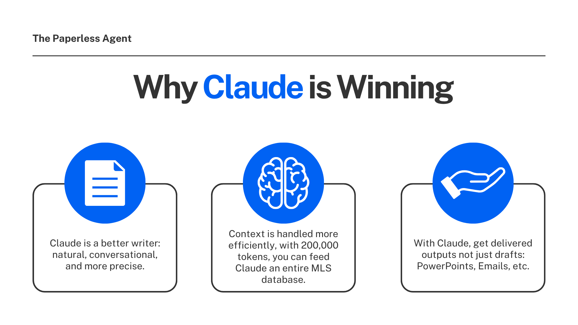 Q: Is Claude really better than ChatGPT for real estate, or is this just a preference? For these three specific use cases — CMA presentations, market update blog posts, and personal newsletters — Claude consistently produces better, more usable outputs with less editing required. ChatGPT retains advantages in image generation, plugin integrations, and Microsoft Office compatibility. For client-facing writing and document processing, Claude wins.