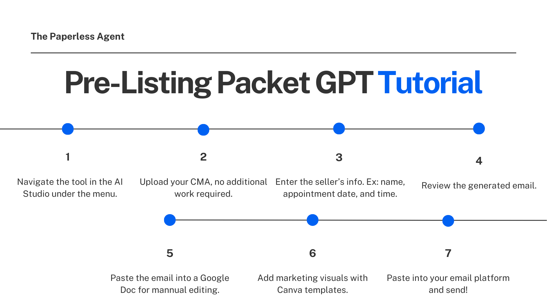 Q: How is this different from just asking ChatGPT to write me a pre-listing email? This tool has been built around the Paperless Agent's specific pre-listing packet format — a system designed to win listings. A generic ChatGPT prompt will give you a serviceable email, but it won't follow the three-section structure, it won't know to avoid committing to a price, and it won't draw from your actual CMA data to personalize the content. The output here is strategic, not generic.