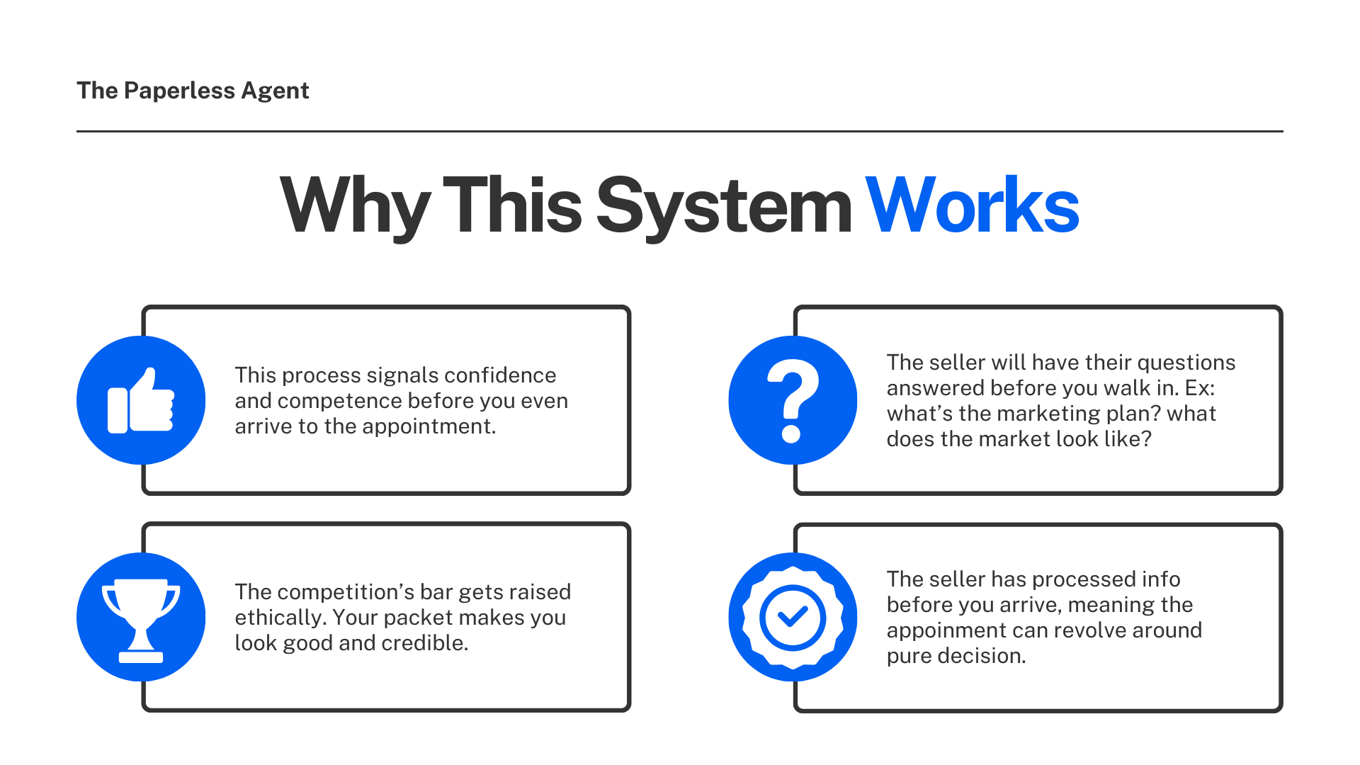It compresses your timeline to a signed agreement. Agents who use pre-listing packets consistently find they need fewer appointments to close listings. The seller has processed the information before you arrive, which means the appointment can focus on the final decision rather than the beginning of the relationship.