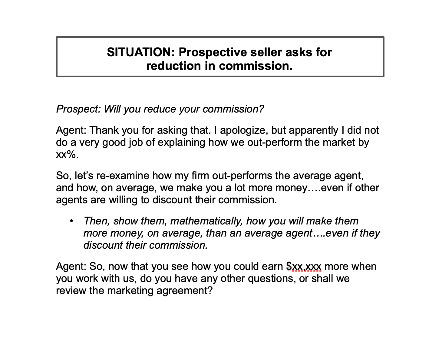 As a professional, we never want to be in a position where we are forced to give up our hard-earned commission to win a new listing. That's why it's so important for us to compete onvaluerather thanprice. We need to create a story for our clients to illustrate how we are different from the competition, and how those differences will benefit them.