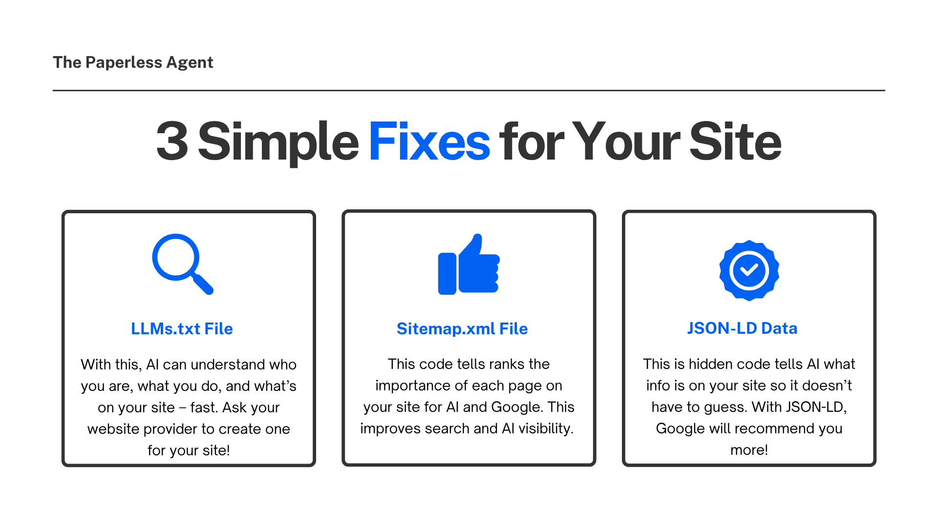 Together, they transform your website from something AI has to work to understand into something it can read confidently and recommend accurately. None of them change your website visually. Your visitors will never see any of this. But the AI bots crawling your site in the background, the ones deciding whether to mention your name the next time a prospective seller asks ChatGPT who to hire, will notice immediately.